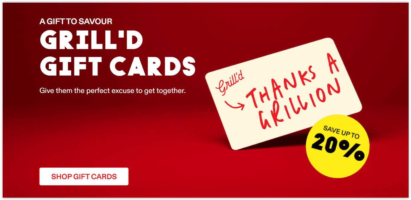 - Save 10–20% on Grill’d Digital Gift Cards – Get a $100 gift card for just $90 or a $200 card for $175. Offer valid for a limited time only.