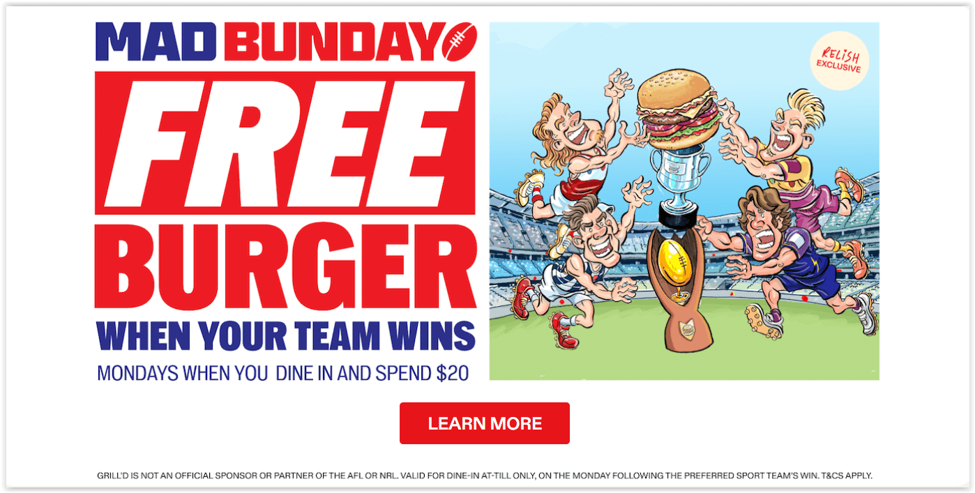 - Mad Bunday Free Burger – Get a free burger when your team wins! Dine in on Mondays and spend $20 to score this tasty reward. Valid on the Monday following your preferred team’s win. Terms and conditions apply.