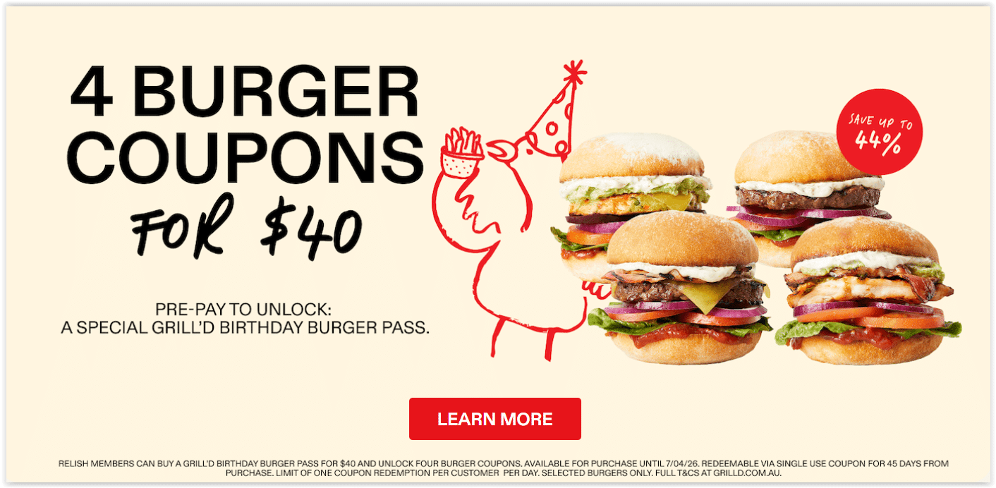 - 4 Burger Coupons for $40 – Get four burger coupons for $40 with the Grill’d Birthday Burger Pass at Grill’d. Pre-pay to unlock the pass and save up to 44% for a limited time.