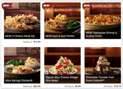 The original Outback Steakhouse menu featured Australian-themed food names such as Jackaroo Chops, Kookaburra Wings, Aussie Cheesefries, and the notorious Bloomin’ Onion, still on the menu board today. Nevertheless, what the restaurant serves is all American food with a side of “Australian fun” and Outback Steakhouse menu prices rated as among the best.