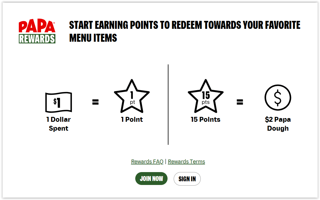 Papa John’s Rewards Program – earn one point for every $1 you spend and redeem the points for free menu items. Get $10 papa dough for every 75 points earned.