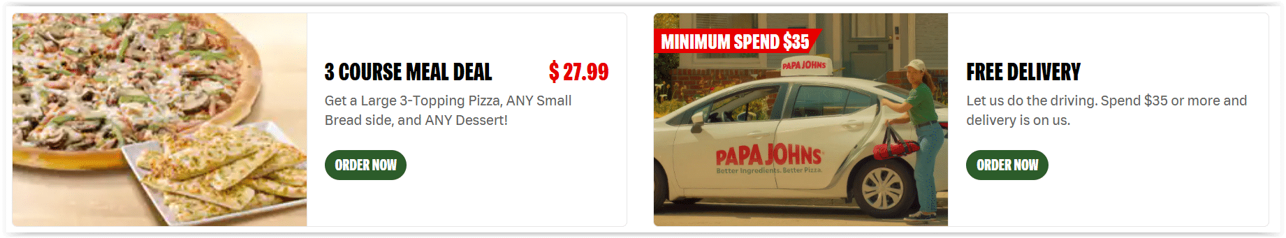 Browse the current Papa John’s Deals & Specials and save with the best pizza deals, Papa John’s Coupons, and get great savings when you order the famous pizzas, breadsticks or desserts. You can also create your own pizza by choosing from options like whole wheat and gluten-free crusts and add your favorite toppings. Papa John’s Pizza is the fourth largest pizza delivery restaurant chain in the United States, and operates over 5,200 restaurants worldwide. View Papa John’s Pizza Menu.