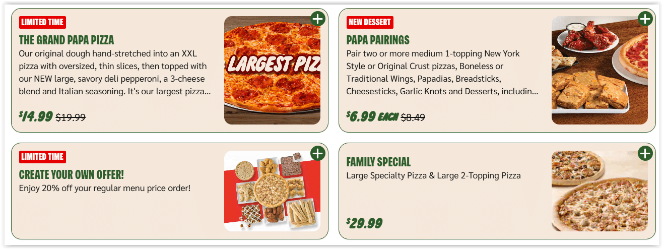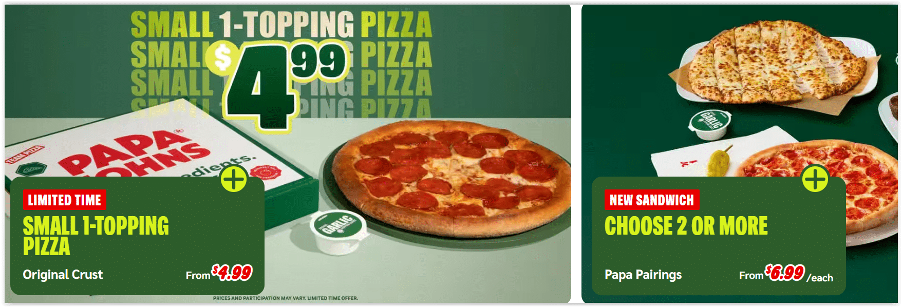 $4.99 Small 1-Topping Pizza – Enjoy a small 1-topping pizza on original crust starting at just $4.99 for a limited time. Pair it with Papa Pairings for $6.99 each when you choose 2 or more, and satisfy every craving for less!