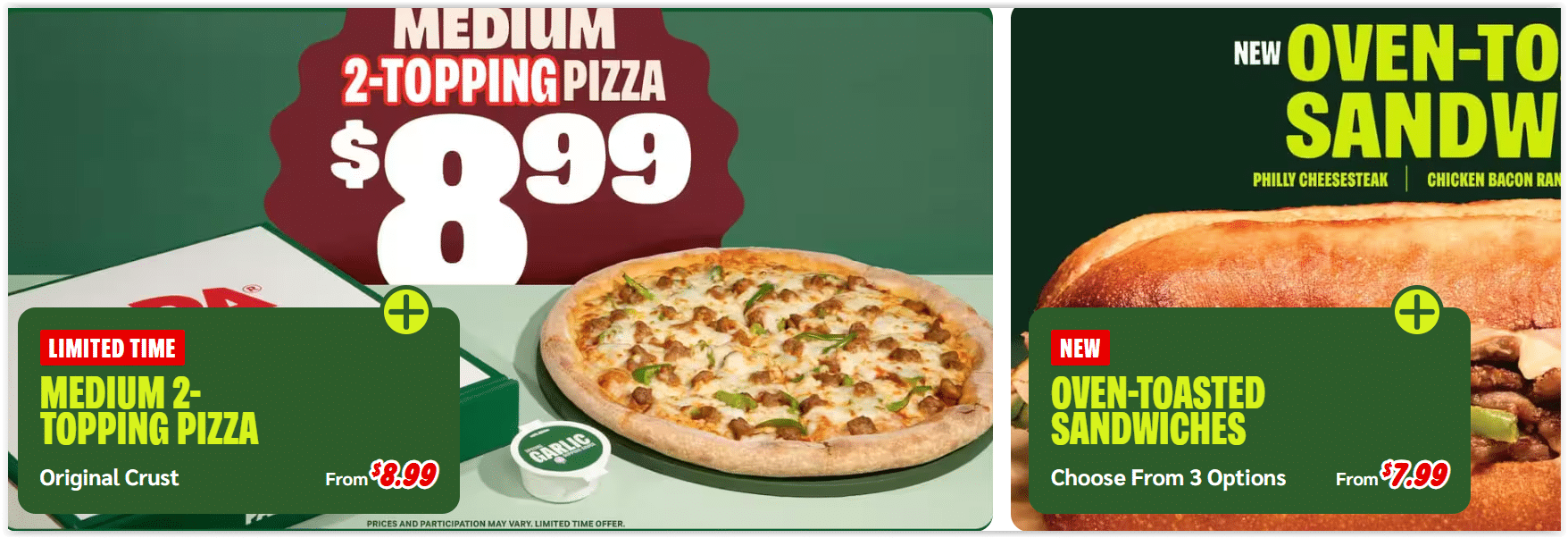 $8.99 Medium 2-Topping Pizza – Grab a medium 2-topping pizza on original crust starting at just $8.99 for a limited time. Want more variety? Try the new Oven-Toasted Sandwiches starting at $7.99 and choose from three delicious options to complete your meal!