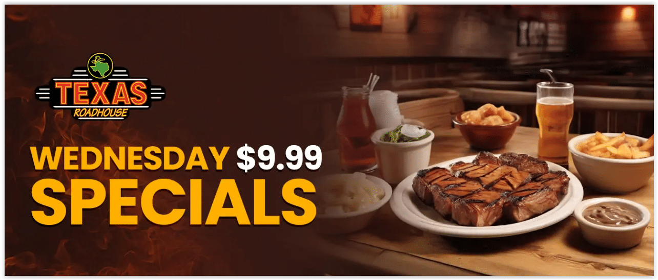 Texas Roadhouse Thursday Specials – Roadhouse runs the Early dine offer on Thursday which includes discounted entrees from 4:00 PM to 6:00 PM. The price of these specials is around $10.99.