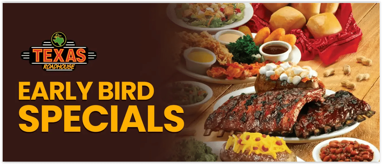 Early Bird Menu starting at only $8.99.  Enjoy a variety of foods at special prices from 3:00 PM to 6:00 PM, Monday through Thursday. Items included in Early Dine Texas Roadhouse Specials: