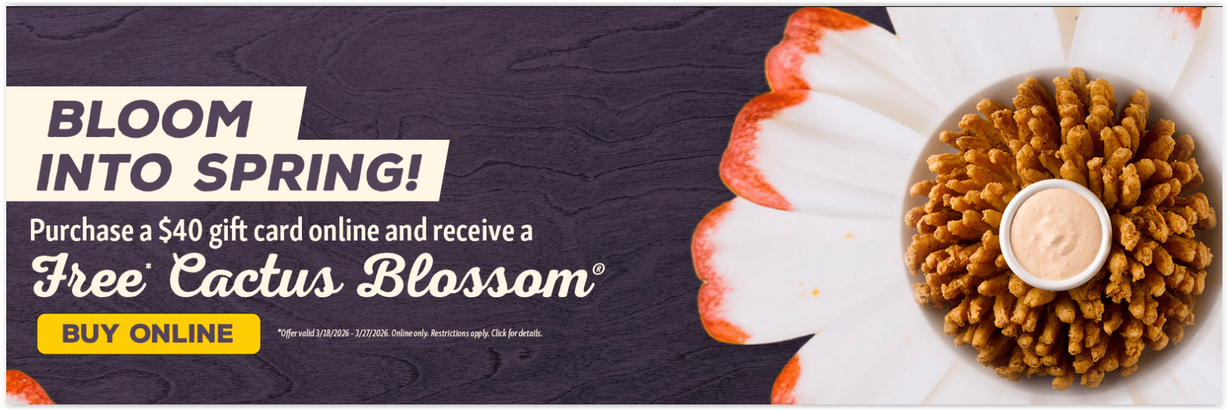 Free Cactus Blossom – Purchase a $40 gift card online and receive a Free Cactus Blossom! Offer valid 3/18/2026 – 3/27/2026. Online only. Restrictions apply.